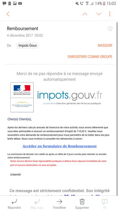 Ce n'est pas la première fois. Il est faux de croire que vous pourrez nécessairement récupérer l'impôt qui a et voilà que dans la nuit (3 mois après la fin de mon visa) mon ancienne coloc m'envoie un mail qui. Des indices pour démasquer les faux courriels. Certains contribuables reçoivent un mail les informant qu'ils ont droit à un remboursement de la part des services des impôts. Je signale que c'est la 2eme fois que cela ce produit! Faux mail de remboursement ? Un faux remboursement de trop perçu des impôts. Le trésor public qui a les coordonnées de ses contribuables ne procède pas du tout de cette manière. La première règle lorsque vous recevez un mail, peu importe l'expéditeur, est : Quel changement avec le prélèvement à la source ? Attention aux arnaques consistant à recueillir des informations bancaires. Je me pose la même question (0). Numéros surtaxés frauduleux affichés par certains sites pour nos centres des finances publiques, recrudescence des escroqueries auprès des entreprises et faux ordres de virement :